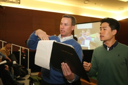 Michael answers one of many questions from the audience with translation help from Titleist staff member Ryan Lo.