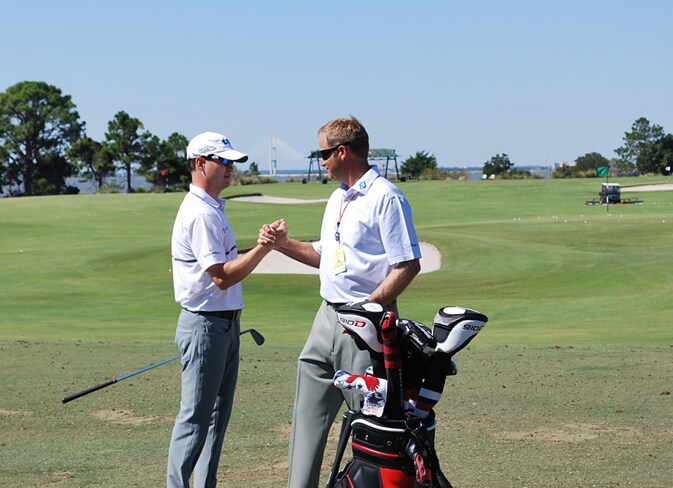 Titleist Tour Rep Chris Tutten congratulates Zach on his week at Celtic Manor.