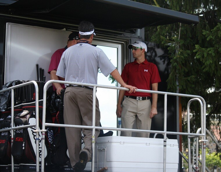 Titleist Brand Ambassador Michael Sim checks in with the team at the Titleist Tour Van.
