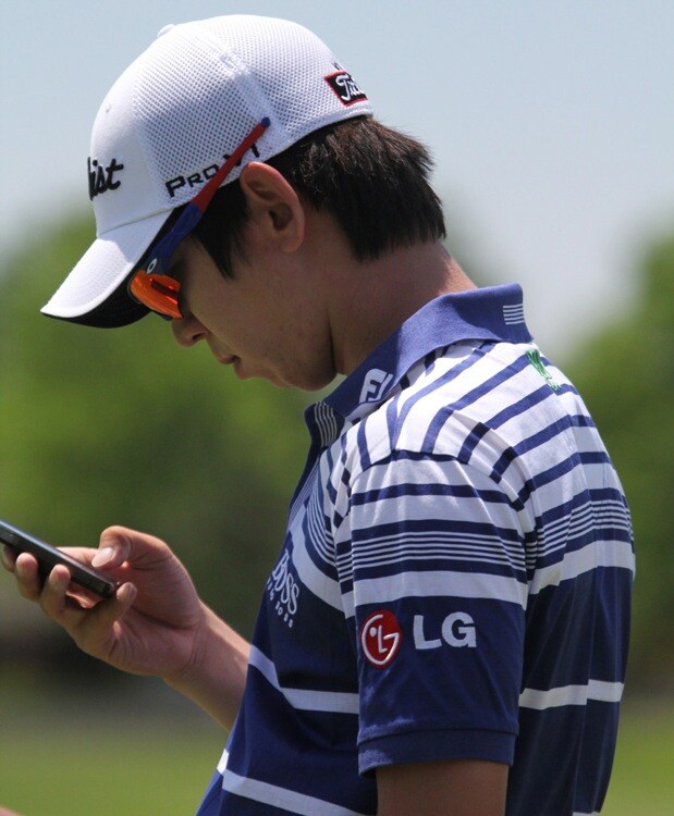Titleist Brand Ambassador Seung-yul Noh takes a quick range break to answer some text messages.