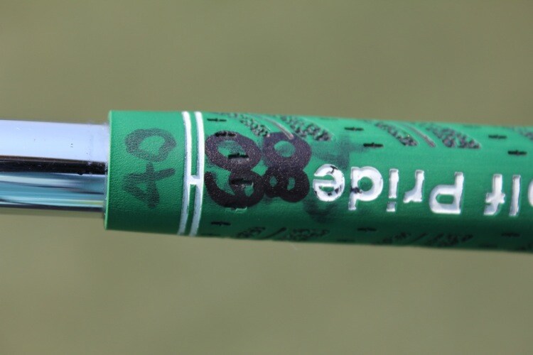 Here's a close-up of one of Ben's black and green multi-compound Golf Pride grips: The numbers represent the distance he hits each club from a certain takeaway position.
