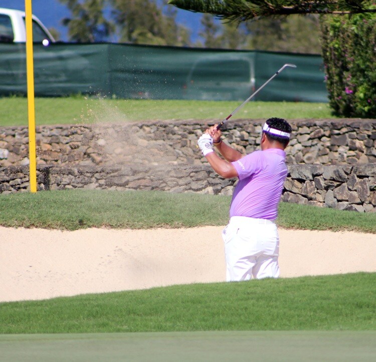 K.J. Choi blasts a Pro V1 out of the practice bunker.