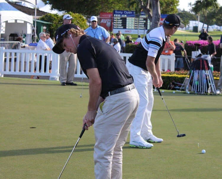 Rockin' and rollin' on the putting green: Titleist Brand Ambassador Bud Cauley (left) and fellow PGA Tour rookie, Pro V1 loyalist Jonas Blixt.