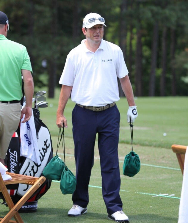 Titleist Brand Ambassador Tim Clark grabs three bags of Pro V1's for his range session.