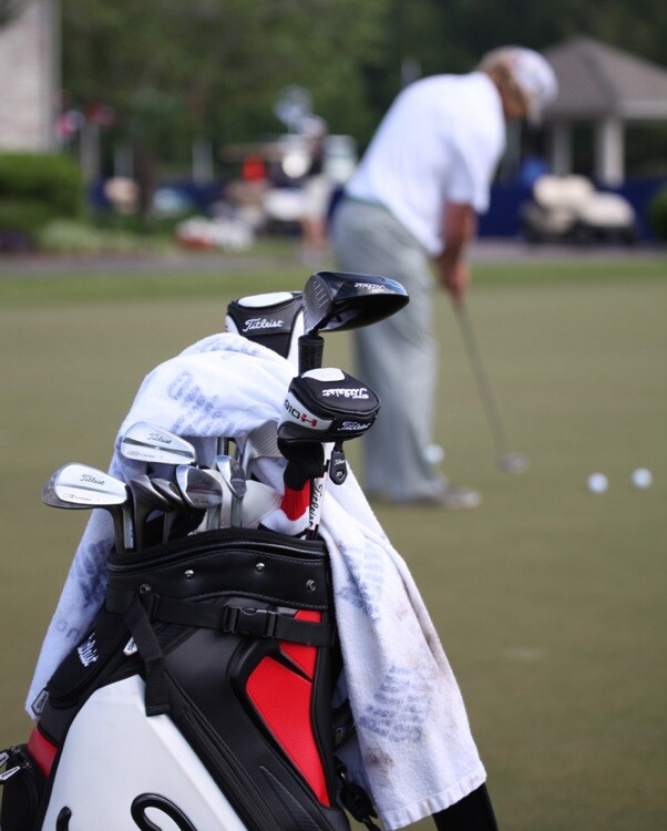 Titleist Brand Ambassador Charley Hoffmann's clubs get a break as he rolls some Pro V1's on the TPC Louisiana putting green.