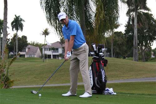 Ross Fisher preparing to tee off during a practice round for the WGC-CA Championship.