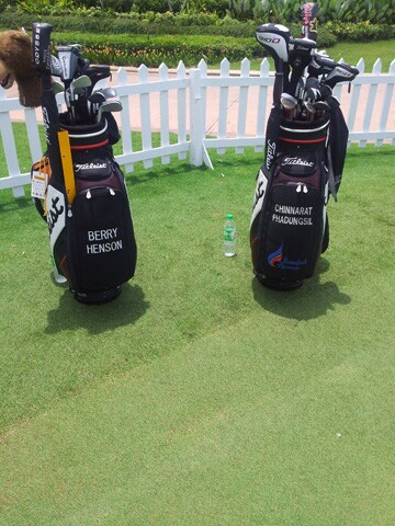 Chinnarat's bag next to Brand Loyalist Berry Henson's, while they both get some practice in on the putting green.