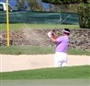 K.J. Choi blasts a Pro V1 out of the practice bunker.